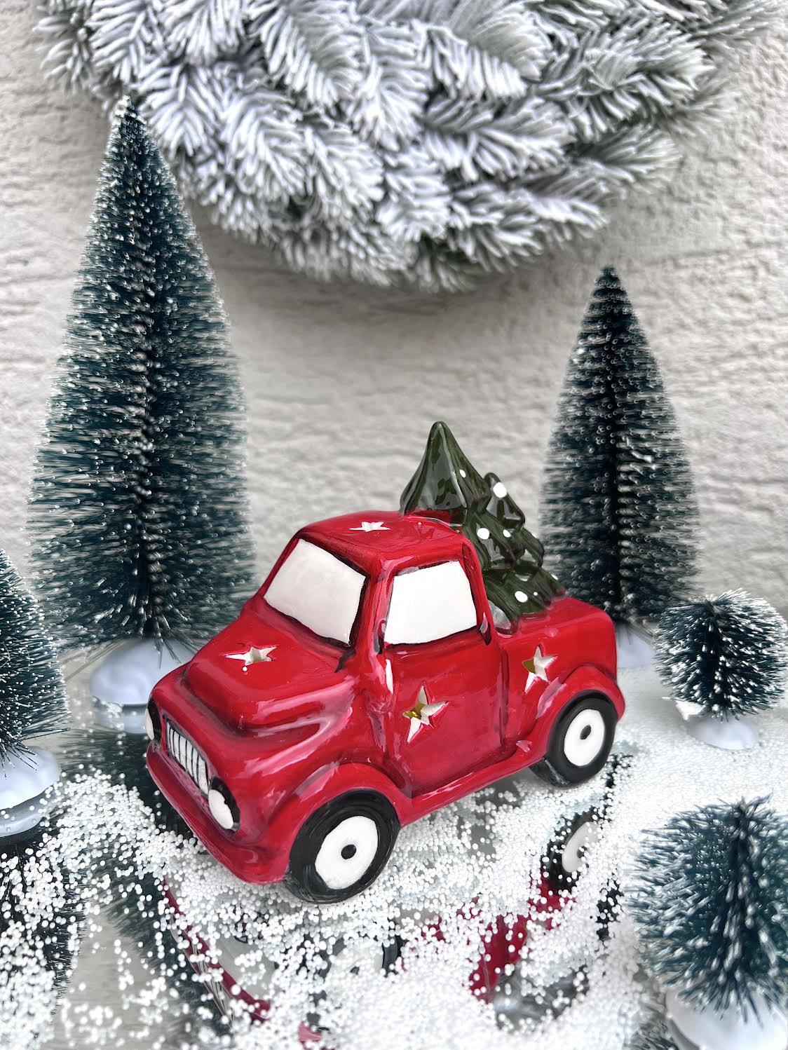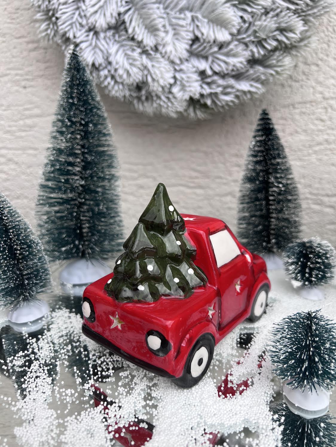Piros világító kerámia autó karácsonyfával